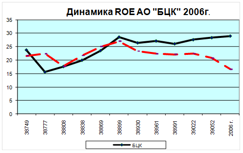 Рисунок 4 - Динамика ROE АО «БЦК» 2006г. По результатам проведенного анализа можно сделать вывод о том, что АО «Банк ЦентрКредит» в 2005-2006 годах продолжил укрепление своих позиций на финансовом рынке Казахстана за счет эффективной финансовой и кредитной политики, а также четко обозначенных стратегических финансовых целей. Поддерживая агрессивную политику развития, «Банк ЦентрКредит» и в будущем будет стремиться повысить показатели своей деятельности на качественно новых уровень для «завоевания» еще большего количества клиентов. 2.2 Анализ портфеля ценных бумаг банка Проводя анализ операций с ценными бумагами банка, можно рассматривать АО «Банк ЦентрКредит» и его дочернюю компанию АО «BCC Invest» с трех различных позиций: - как эмитента ценных бумаг; - как профессионального участника рынка ценных бумаг; - как инвестора. В настоящее время АО «Банк ЦентрКредит» провел 3 эмиссии облигаций на общую сумму 64 800 000 000 тенге и несколько эмиссий акций. Структура ценных бумаг, эмитированных АО «Банк ЦентрКредит», существенно менялась. В зависимости от цели эмиссии в различные периоды времени преобладающую роль играют то облигации, когда банк нуждается в привлечении дополнительного заемного капитала, то акции, когда преследуется цель увеличения собственного капитала. АО «Банк ЦентрКредит» проводит операции на рынке ценных бумаг. Банк, являясь первичным дилером на рынке государственных бумаг, предлагает брокерские услуги для различных инвесторов: банков, организаций осуществляющих инвестиционное управление пенсионными активами, страховых компаний. Портфель на 01 июля 2006 г. составил 69,2 млрд. тенге. Таблица 5 - Финансовые показатели Акционерного общества «BCC Invest» - дочерней организации АО «Банк ЦентрКредит». тыс. тенге