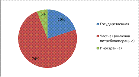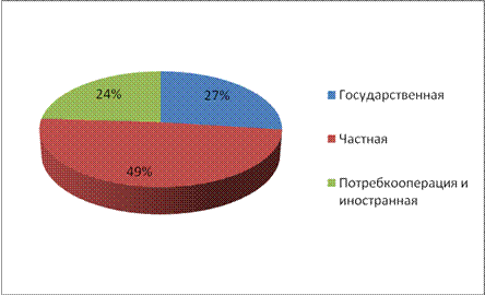 Рисунок 1.4. Распределение организаций розничной торговли по формам собственности Общественное питание (торгово-производственная деятельность) представляет собой вид торговли, включающий производство, переработку, реализацию и организацию потребления продуктов питания с оказанием либо без оказания сопутствующих услуг населению. Оно осуществляется через торговые объекты общественного питания, которые подразделяются на типы (столовая, ресторан, кафе, закусочная, буфет, бар и т.п.), имеющие наценочные категории (люкс, высшая, первая, вторая, третья), либо не имеющие их. Сеть объектов общественного питания республики составляет 8,7 тыс. единиц. Доля различных форм собственности в общественном питании показана на рисунке 1.5 [19, с.15].