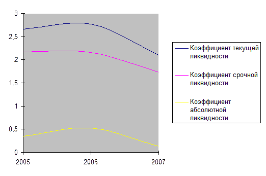 1.4. Анализ ликвидности предприятия Чистые оборотные активы . ОАЧ = ОА - КО ОАЧ 1 = 6080784 ОАЧ 2 = 7020614 ОАЧ 3 = 1463006 Данный коэффициент может свидетельствовать о том, что предприятие не только может погасить свои краткосрочные обязательства, но и имеет финансовые ресурсы для расширения своей деятельности в будущем. Абсолютный показатель ликвидности. ЛА = (А1+А2)-(П1+П2) ЛА 1 = 10728593 ЛА 2 = 10598247 ЛА 3 = 10404278 Абсолютный показатель ликвидности положителен, следовательно, предприятие в состоянии погасить свои обязательства в ближайшем будущем. Перспективная ликвидность. ЛП = А3-П3 ЛП 1 = 397627 ЛП 2 = 2525253 ЛП 3 = 30744144 Положительное значение перспективной ликвидности тпк же говорит о хорошей платежеспособности предприятия. Коэффициент текущей ликвидности. КТЛ = ОА/КО КТЛ = 2,659157 КТЛ = 2,76781 КТЛ = 2,103255 Коэффициент быстрой (срочной) ликвидности. КСЛ = (ДС+ДЗ)/КО КСЛ = 2,162979 КСЛ = 2,159078 КСЛ = 1,734305 Коэффициент мгновенной (абсолютной) ликвидности. КАЛ = ДС/КО КАЛ = 0,345443 КАЛ = 0,530082 КАЛ = 0,132498