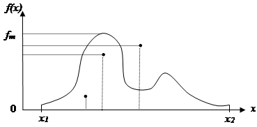 Рисунок 3 - Метод вилучення Метод вилучення (рис. 3) дозволяє отримати випадкове число, якщо ми знаємо щільність розподілу f(x) випадкової величини Х . Його суть полягає в наступних діях: · спочатку генерується випадкове число x