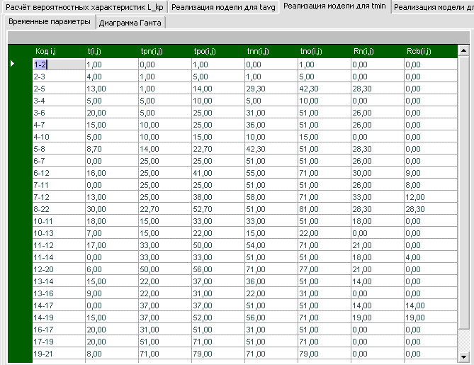Якщо 3.2 Розробка програмного забезпечення для моделювання Програмне забезпечення для моделювання сітьового графіка методом статистичних випробувань базується на ПЗ, розробленому в 2 розділі. Під час моделювання, суть якого описана в попередньому підрозділі, на дісплей виводяться діаграми Гантта для кожної реалізації сітьового графа, також заповнюються масиви T кр , t р , t п . Після цього проводиться аналіз імовірносних характеристик отриманих випадкових величин. Результати аналізу заносяться до текстового файлу. 3.3 Результати розрахунків