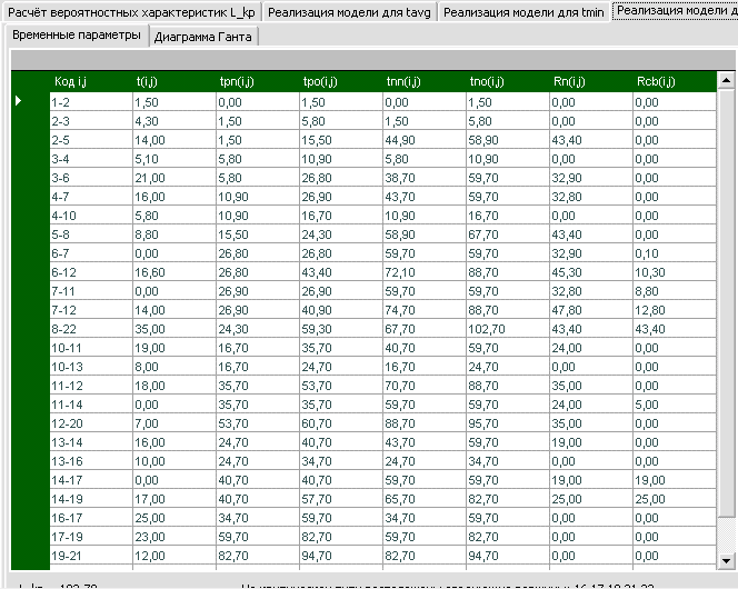 Рисунок 8 – График статистического распределения T_kp Данное распределение можно считать нормальным Результати виконання прогрими зберігаються у файлах. ВИСНОВКИ Моделювання сітьового графіка методом статистичних випробувань можна вважати більш достовірним, ніж детерміноване моделювання, бо отримані параметри СГ розгдядаються в ньому як випадкові величини. Такий підхід дозволяє розробити модель, більш наближену до реальних умов процесу створення судна. Також треба відзначити, що метод Монте-Карло враховує зміну не лише довжини критичного шляху, а й списку вершин, через які він проходить. При моделювання сітьового графіка методом статистичних випробувань за початковими данними було з’ясовано, що T кр є нормально розподіленою випадковою величиною. Це обумовлено тим, що критичний шлях був постійним в кожній з реалізацій. Проте не всі t р it п подій розподілені за нормальним законом, це викликано недостатньою кількістю випробувань. Таке допущення підтверджується тим, що зі збільшенням числа випробувань, збільшується і кількість t р та t п , розподілених за Гаусом. Однак використаний компілятор не дозволяє збільшити кількість експериментів через перевищення допустимого розміру сегменту даних. Така сітуація характерна для даного методу, бо кількість даних для обробки при достатньо великій кількості робіт накладає певні вимоги до програмних та апаратних засобів. Такі вимоги і є головним недоліком для застосування методу статистичних випробувань. СПИСОК ВИКОРИСТАНОЇ ЛІТЕРАТУРИ 1. Ахо, Альфред, В., Хопкрофт, Джон, Ульман, Джеффи, Д. Структуры данных и алгоритмы.: Пер. с англ.:Уч. пос. – М.: Издательский дом «Вильямс», 2000. – 384 с.: ил. – Парал. тит. англ. 2. Брехов А. М., Волков В. В. Организация судостроительного производства в условиях рынка. – СПб.: Судостроение, 1992. – 224 с., ил. 3. Колде Я. К. Практикум по теории вероятностей и математической статистике: Учеб. пособие для техникумов. – М.: Высш. шк., 1991. – 157 с.: ил. 4. Полковников А.В., Корпоративная система управления проектами, Электронный офис, 1997, Октябрь 5. Полковников А.В., Линия на которой побеждают время, Электронный офис, 1997, Октябрь Додаток А – Текст программи usingSystem; using System.Drawing; using System.Drawing.Drawing2D; using System.Collections; using System.ComponentModel; using System.Windows.Forms; using System.Data; using System.IO; using System.Diagnostics; namespace WindowsApplication1 { public class Form1 : System.Windows.Forms.Form { private const int mx=5; private const int ht=8; private const int zz=130; private int n,m,k,v; static int /*nij,*/n_ij; private double Mx,S2x,Sx,X_2; private double L_kp_min,L_kp_max,L_kp_avg; private double L_kp_mat,L_kp_dsp,L_kp_otk; private System.Windows.Forms.MainMenu mainMenu1; private System.Windows.Forms.MenuItem menuItem1; private System.Windows.Forms.MenuItem menuItem2; private System.Windows.Forms.OpenFileDialog openFileDialog1; private ArrayList codi,codj,naim,mint,maxt; private double []tp_min; private double []tp_max; private double []tp_avg; private double []tn_min; private double []tn_max; private double []tn_avg; private double []R_min; private double []R_max; private double []R_avg; private double []r_min; private double []r_max; private double []r_avg; private double [,]tpn_min; private double [,]tpn_max; private double [,]tpn_avg; private double [,]tnn_min; private double [,]tnn_max; private double [,]tnn_avg; private double [,]tpo_min; private double [,]tpo_max; private double [,]tpo_avg; private double [,]tno_min; private double [,]tno_max; private double [,]tno_avg; private double [,]Rn_min; private double [,]Rn_max; private double [,]Rn_avg; private double [,]Rcb_min; private double [,]Rcb_max; private double [,]Rcb_avg; private double [,]C_min; private double [,]C_max; private double [,]C_avg; private int [,]P_min; private int [,]P_max; private int [,]P_avg; private double [,]C_rev_min; private double [,]C_rev_max; private double [,]C_rev_avg; private int [,]P_rev_min; private int [,]P_rev_max; private int [,]P_rev_avg; private System.Windows.Forms.TabControl tabControl1; private System.Windows.Forms.TabPage tabPage1; private System.Windows.Forms.TabPage tabPage2; private System.Windows.Forms.TabControl tabControl2; private System.Windows.Forms.TabPage