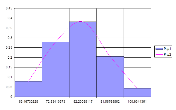 Рисунок 5 - Гістограма і графік щільності випадкової величини Х Очевидно, що при збільшенні числа дослідів можна вибирати все більше і більше дрібні інтервали. При цьому гістограма (рис. 5) все більше і більше наближатиметься до деякої кривої, що обмежує площу рівну одиниці. Неважко бачити, що крива уявляє собою графік щільності випадкової величини Х. Критерій Пірсона для перевірки гіпотези про нормальний розподіл обчислюється наступним чином: