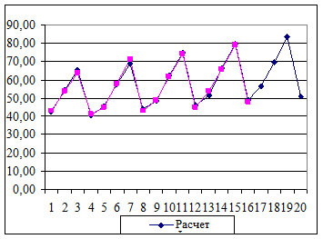 Уровни ряда остатков подчиняются нормальному распределению т.к полученное значение RS (3,57) попадает в заданный интервал (3,00<3,57<4,21). Таким образом, все условия адекватности и точности выполнены. Следовательно, можно говорить об удовлетворительном качестве модели и возможности проведения прогноза показателя Yp (t) на год. 4. Расчет прогнозных значений экономического показателя. Составим прогноз на четыре квартала вперед (т.е. на 1 год, с t=17 по t=20). Максимальное значение t, для которого могут быть рассчитаны коэффициенты
