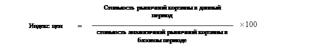 Индекс цен — это отношение стоимости опредёленного набора товаров или услуг (рыночной корзины) в данном периоде к стоимости того же самого набора в определенном базовом периоде, умноженное на 100: Индекс цен = стоимость рыночной корзины в данный период / стоимость аналогичной рыночной корзины в базовом периоде [1, c.149-150]. Прогнозирование инфляции можно осуществлять на основе индексов потребительских цен. Индекс потребительских цен часто называют индексом стоимости жизни. По изменениям этого индекса можно судить о том, насколько увеличение доходов или заработной платы обесценивается вследствие роста цен. Индекс потребительских цен рассчитывается по типу индекса Ласпейреса, или индекса цен с базисными весами (набором благ, фиксированным по базисному году):