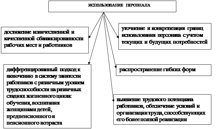 Рисунок 5 - Направления рационального использования персонала Предприятие в процессе работы с персоналом сталкивается с определенными проблемами, такими как текучесть кадров, неравномерность их загрузки, моральное и физическое устаревание персонала, и, как следствие, необходимость в сокращении. Если на предприятии большая текучесть кадров, то появляются дополнительные расходы, связанные с поисками новой рабочей силы, ее инструктажем и освоением работ. При высокой текучести кадров растут размер оплаты сверхурочных работ, брак и простои, повышается уровень заболеваемости, производственного травматизма, наступает ранняя инвалидность. Все это ведет к увеличению расходов на персонал, к росту себестоимости продукции и снижению ее конкурентоспособности. Если предприятие попадает в ситуацию кризиса, то одним из способов повышения его сопротивляемости, улучшения в будущем финансового положения может стать частичное сокращение персонала, увольнение неэффективных работников. Однако при использовании традиционных форм сокращения (увольнения по прошествии установленного законом срока) возникает множество негативных последствий, которые часто сводят к минимуму возможный выигрыш. Таким образом, сокращать надо, но использовать традиционные способы воздействия на персонал (административные, экономические и другие силовые) неэффективно. Решить проблему можно, используя недирективные (нежесткие) формы сокращения. Они связаны с доведением до индивидуального сознания каждого сотрудника необходимости изменить свое поведение, место в структуре, задуматься о необходимости оставаться именно на этом предприятии. Основной инструмент недирективного сокращения — эмоционально-ценностные мотивы при формировании решения об увольнении, и, в конечном итоге, принятие каждым решения или преодоление негативного отношения к решению руководства о возможностях ухода с предприятия. Именно недирективные методы позволяют получить экономический и психологический эффект от сокращения персонала. Возрастающая сложность производственной деятельности приводит к «моральному износу» и «устареванию» рабочей силы. Под «устареванием» в этом случае понимают использование работником теорий, понятий и методов, которые являются менее эффективными, чем принятые в настоящее время. При «профессиональном устаревании» знания работника в широкой профессиональной сфере деятельности отстают от совокупности знаний, существующих в этой области. «Устаревание по должности» свидетельствует о несоответствии уровня технических знаний, которыми обладает специалист, занимающий определенную должность, и объема этих знаний, требуемых по должности. «Устаревшие» специалисты и менеджеры принимают, как правило, неэффективные решения, что влечет за собой снижение конкурентоспособности и, в конечном счете, приводит к серьезным потерям предприятия. Итак, как повысить эффективность использования «человеческого фактора» в современных условиях? Прежде всего, необходимо создать возможности для профессионального роста каждого работника, обеспечения его уверенности в будущем, для формирования хороших взаимоотношений и настроя в трудовых коллективах. Здесь социологи предлагают5 : а) разрабатывать и осуществлять программы профессионального продвижения для 