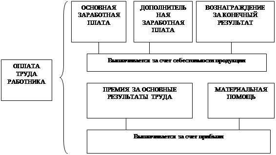 Рисунок 6 - Структура оплаты туда работников количеством оборудования, а также правил, регулирующих трудовую деятельность. Нормы должны соответствовать наиболее эффективным для условий данного участка вариантам технологического процесса, организации труда, производства и управления. Большинство задач, связанных с проектированием организации труда и его нормированием, решается исходя из информации, получаемой в результате исследований трудовых процессов. Они проводятся для определения структуры операций и затрат рабочего времени, рационализации приемов и методов труда, выявления причин невыполнения норм, нерациональных затрат рабочего времени, получения данных о факторах, влияющих на время выполнения элементов операции, разработки нормативных материалов, оценки качества норм и нормативов, а также для решения ряда других задач. При организации труда наибольшее значение имеют две задачи, связанные с исследованием трудовых процессов. Первая состоит в определении фактических затрат времени на выполнение элементов операций (трудовых движений, действий, приемов и т. д.); вторая — в установлении структуры затрат времени на протяжении рабочей смены или ее части. Определение длительности выполнения элементов операций необходимо для разработки нормативов времени, выбора наиболее рациональных методов труда, установления составляющих норм времени, анализа качества норм и нормативов. Данные о структуре затрат рабочего времени используются при разработке нормативов времени обслуживания рабочего места и подготовительно-заключительного времени, оценке эффективности использования рабочего времени, анализе существующей организации труда ипроизводства. Методы исследования трудовых процессов могут классифицироваться по ряду признаков: цели исследования, количеству наблюдаемых объектов, способу проведения наблюдения, форме фиксации его данных и т. д. В соответствии с целью исследования выделяют следующие методы: хронометраж, фотография рабочего времени, фотохронометраж. Хронометраж служит для анализа приемов труда и определения длительности повторяющихся элементов операций. Фотография рабочего времени (ФРВ)применяется для установления структуры его затрат на протяжении рабочей сменыили ее части. Термин «фотография» достаточно точно отражает сущность этого метода. Если при хронометраже объектом изучения, как правило, являются элементы оперативного времени на конкретный вид продукции, то при ФРВ фиксируются затраты времени на все виды работ и перерывов, которые наблюдались в течение определенного отрезка времени. При этом элементы оперативного времени выделяются, укрупнено (до приемов или комплексов приемов). Структура затрат времени при ФРВможет устанавливаться по различным классификационным схемам. Фотохронометраж применяется для одновременного определения структуры затрат времени и длительности отдельных элементов производственной операции. По количеству наблюдаемых объектов различают индивидуальные, групповые, маршрутные наблюдения. Индивидуальным является наблюдение за одним объектом (рабочим, станком); групповым — за несколькими объектами. Разновидностями группового наблюдения являются бригадное (за рабочими бригады) и многостаночное (за рабочими и станками на многостаночном рабочем м