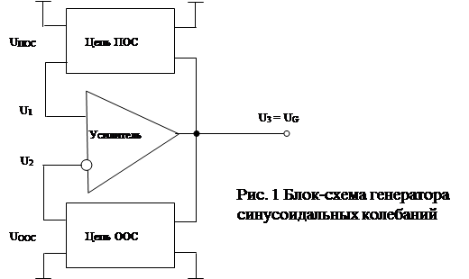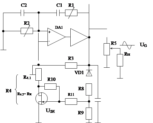 3. Описание принципиальной схемы RC - генератор синусоидальных колебаний - рис.2 собран на операционном усилителе (ОУ) с фазирующей цепью – положительная обратная свіязь (ПОС) в виде моста Вина и нелинейной отрицательной обратной связью (ООС) на базе терморезистора, лампочки накаливания или полевого транзистора. Плавное регулирование частоты осуществляется при помощи сдвоенного резистора R1 в цепи ПОС. Нелинейный элемент в цепи ООС обеспечивает баланс амплитуд, при котором начальное значение коэффициента усиления поддерживается равным коэффициенту затухания фазирующей цепи. Следовательно постоянство напряжения на выходе генератора обеспечивается системой автоматического регулирования. Сигнал с выхода генератора поступает на вход усилителя мощности – один из вариантов эмиттерного повторителя, обеспечивающего разгрузку операционного усилителя. Таким образом задана следующая схема генератора синусоидальных колебаний на ОУ – рис. 1.