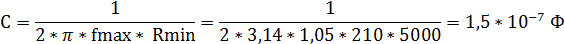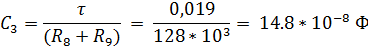Выбираю: Емкость конденсатора С3 рассчитывают, задавшись постоянной времени t = (R8+R9)C3, которая должна быть в несколько раз больше периода генерируемого напряжения при минимальной частоте: t = (3..5)/fmin