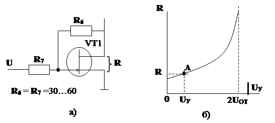 Рис.2. Включение полевого транзистора в качестве нелинейного сопротивления: а) - схема, б) - зависимость RК(Uy). 4.3 Расчёт сопротивлений в цепи ООС В установившемся режиме работы генератора коэффициент усиления усилителя равен коэффициенту затухания фазирующей цепи, т.е. K =γ Для схемы с симметричным мостом Вина (см. рис. 1), коэффициент усиления:
