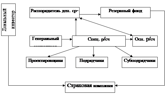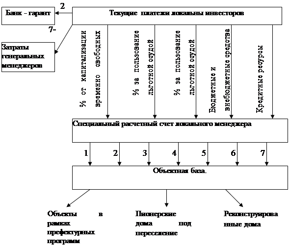 Рисунок 2 - Организационно – финансовая структура источников финансирования, предложенная КОМБИИНВЕСТом. 1 – проектно-изыскательные работы; 2 – предпроектные работы; 3 – разрешительная документация; 4 – рабочий проект; 5 – строительно-монтажные работы; 6 – плата за пользование кредитом; 7 – возврат инвестиционных средств и доходов по ним. Генеральный менеджер – это предприятие, юридическое лицо, организующее процесс строительства (реконструкции). Локальный менеджер – организация, которая занимается непосредственно на месте.