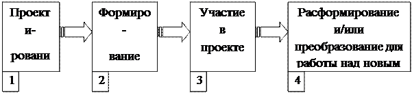Этап «адаптации» c точки зрения деловой активности характеризуется как этап взаимного информирования и анализа задач. На этом этапе происходит поиск членами группы оптимального способа решения задачи. Межличностные взаимодействия осторожны и ведут к образованию диад, наступает стадия проверки и зависимости, предполагающая ориентировку членов группы относительно характера действий друг друга и поиск взаимоприемлемого поведения в группе. Члены команды собираются вместе с чувством настороженности и принужденности. Результативность команды на данном этапе низка, так как члены ее еще не знакомы и не уверены друг в друге. Этап «группирование и кооперация» характеризуется созданием объединений по симпатиям и интересам. Отдельные подгруппы быстро понимают невозможность эффективного решения задачи без коммуникации и взаимодействия с другими подгруппами, что приводит к формированию схем общения и интергрупповых норм, общих для группы в целом. Здесь впервые возникает сложившаяся группа с отчетливо выраженным чувством «мы». На стадии «нормирования деятельности» разрабатываются принципы группового взаимодействия, и нормируется либо область внутригрупповой коммуникации, либо область коллективной деятельности. Характерная черта развития группы на этой стадии – отсутствие интергрупповой активности. Процесс обособления сплоченной, хорошо подготовленной, единой в организационном и психологическом отношениях группе может превратить ее в группу-автономию, для которой характерны замкнутость на своих целях, эгоизм. Стадию «функционирования» c точки зрения деловой активности можно рассматривать как стадию принятия решений конструктивными попытками успешного решения задачи. На этом этапе группа достигает высшего уровня социально-психологической зрелости, отличаясь высоким уровнем подготовленности, организационным и психологическим единством, характерными для командной субкультуры. Различные авторы сморят на процесс формирования с разных сторон. Так, например, доктор технических наук Новиков Д.А. указывает на то, что этап формирования и этап функционирования – это два временных этапа существования команды и их следует различать. Формирование команды может быть, в свою очередь, подразделено на формирование составакоманды и ее адаптацию, после чего возможен уже этап «стационарного» функционирования. Тут же можно отметить, что следует различать еще и процесс подготовки к формированию, процесс развития и дальнейшую поддержку команды топ-менеджментом. Возможно выделение и несколько других, но похожих на перечисленные выше, этапов. Так, например, другие авторы выделяют следующие четыре этапа формирования команды:
