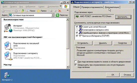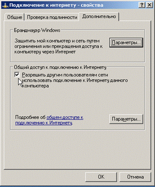 1. В диалоговом окне имя компьютера , введите имя компьютера или IP-адрес сервера терминалов или компьютера, имеющего включено дистанционное управление рабочим столом. 2. Нажимаете кнопку Подключение . 3. В диалоговом окне Вход в Windows диалоговое окно введите имя пользователя, пароль и домен (при необходимости) и нажмите кнопку OK . 2. 4 Общий доступ к Интернету Общий доступ к Интернету (ICS) позволяет использовать Windows Server 2003 для подключения небольшой офисной сети или домашней сети через Интернет. Механизм ICS обеспечивает преобразование сетевых адресов (NAT), назначение IP-адресов и разрешение имен для всех компьютеров в небольшой сети. Для установки ICS требуется следующее оборудование и программное обеспечение: 1. Цифровая абонентская линия (DSL) или кабельный модем, подключенный к поставщику услуг Интернета (ISP), а также активированную учетную запись DSL или кабельного интернета. 2. Два установленных сетевых адаптера. 3. Сеть, с уже настроенными TCP/IP. 2. 4.1 Настройка главного компьютера ICS На узловом компьютере ICS обеспечивает подключение через второй сетевой адаптер для существующей сети TCP/IP. Чтобы настроить главный компьютер ICS, необходимо войти в систему с помощью учетной записи члена группы «Администраторы». 1. Нажмите Пуск , затем Панель управления и выбирайте команду Сетевые подключения. 2. Далее нажимаете правой кнопкой мыши на Подключение по локальной сети (к которой подключен интернет) и переименуйте его в Подключение к интернету. 3. В диалоговом окне Сетевые подключения , отображаются два подключения: Подключение к интернету и Подключение по локальной сети. 4. Нажмите правой кнопкой мыши по Подключение к Интернету и выберите команду Свойства . 5. В «свойствах» перейдите на вкладку Общие , и убедиться что в компонентах отображены и выбраны Клиент для сетей Microsoft и Протокол Интернета (TCP/IP) .