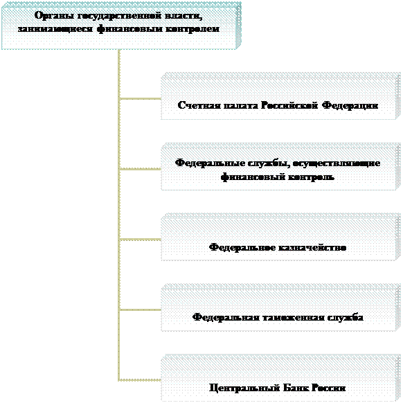 Органы государственной власти, занимающиеся финансовым контролем Финансовый контроль, осуществляемый органами исполнительной власти, органами (должностными лицами) местных администраций муниципальных образований, осуществляют Федеральная служба финансово-бюджетного надзора, Федеральное казначейство, финансовые органы субъектов Российской Федерации и муниципальных образований и (или) уполномоченные ими органы, главные распорядители, распорядители бюджетных средств[6] . Счетная палата Российской Федерации является постоянно действующим органом государственного финансового контроля, образуемым Федеральным Собранием Российской Федерации и подотчетным ему. В рамках задач, определенных действующим законодательством, Счетная палата обладает организационной и функциональной независимостью[7] . В процессе реализации своих задач Счетная палата осуществляет контрольно-ревизионную, экспертно-аналитическую, информационную и иные виды деятельности, обеспечивает единую систему контроля за исполнением федерального бюджета и бюджетов внебюджетных фондов. Контрольные полномочия Счетной палаты распространяются на все государственные органы и учреждения в России, на федеральные внебюджетные фонды, а также на органы местного самоуправления, предприятия, организации, банки, страховые компании и другие финансово-кредитные учреждения, их союзы, ассоциации и иные объединения вне зависимости от видов и форм собственности, если они получают, перечисляют, используют средства из федерального бюджета, или используют федеральную собственность либо управляют ею, а также имеют предоставленные федеральным законодательством или федеральными органами государственной власти налоговые, таможенные и иные льготы и преимущества. Счетная палата также осуществляет контроль за деятельностью Банка России, его структурных подразделений, других банков и кредитно-финансовых учреждений. Федеральные службы, осуществляющие финансовый контроль , находящиеся в ведении Министерства финансов Российской Федерации органы исполнительной власти, осуществляющие свою деятельность непосредственно и через свои территориальные органы во взаимодействии с другими федеральными органами исполнительной власти, органами исполнительной власти субъектов Российской Федерации, органами местного самоуправления, общественными объединениями и иными организациями: Федеральная налоговая служба (ФНС) осуществляет контроль и надзор за: - соблюдением законодательства Российской Федерации о налогах и сборах, а также принятых в соответствии с ним нормативных правовых актов, правильностью исчисления, полнотой и своевременностью внесения налогов и сборов, а в случаях, предусмотренных законодательством Российской Федерации, — за правильностью исчисления, полнотой и своевременностью внесения в соответствующий бюджет иных обязательных платежей; - проведением валютных операций резидентами и нерезидентами, не являющимися кредитными организациями; - полнотой учета выручки денежных средств в организациях и у индивидуальных предпринимателей; - проведением лотерей, в том числе за целевым использованием выручки от проведения лотерей и др. ФНС России и ее территориальные органы — управления ФНС России по субъектам Российской Федерации, межрегиональные инс