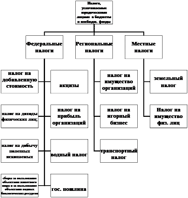 Схема налоговых платежей, уплачиваемых в бюджеты ивнебюджетные фонды юридическими лицами Классификация налогов — это система их группировки по определенным признакам. По объекту налогообложения : операции на реализацию, имущество, землю, капитал, прибыль, доход, средства потребления. По источнику уплаты : заработная плата, выручка, прибыль, себестоимость. По принадлежности к уровню власти и управления : федеральные; региональные; местные. Из фонда оплаты труда организаций-работодателей будет уплачен налог на доходы физических лиц, а также взносы на обязательное пенсионное страхование и взносы на страхование от несчастных случаев на производстве и профессиональных заболеваний. Плательщиками страховых взносов на обязательное пенсионное страхование признаются работодатели — юридические лица, в том числе иностранные, их обособленные подразделения, осуществляющие прием на работу по трудовому договору, заключающие договоры гражданско-правового характера, предметом которых являются выполнение работ и оказание услуг, в отношении граждан, имеющих право на трудовую пенсию и застрахованные в соответствии с Федеральным законом «Об обязательном пенсионном страховании в Российской Федерации»[9] . Пенсионное взносы делятся на страховую и накопительную части трудовой пенсии и могут зачитываться в счет части единого социального налога, предусмотренной для уплаты в федеральный бюджет. Косвенные налоги – налоги, которые являются надбавкой к цене или определяются в зависимости от размера добавленной стоимости, оборота или продаж товаров, работ, услуг. Косвенные налоги вытекают из хозяйственных актов и оборотов, финансовых операций (НДС, таможенная пошлина, налог на операции с ценными бумагами и др. налоги.). Косвенные налоги взимаются в процессе движения доходов или оборота товаров, работ и услуг. Эти налоги включаются в виде надбавки в цену товара, а также тарифа на работы или услуги и оплачиваются потребителем. Владелец товара, работы или услуги при их реализации получает с покупателя одновременно с ценой и налоговые суммы, которые затем перечисляет государству. Поэтому косвенные налоги нередко называют налогами на потребление. Таким образом, указанные налоги предназначаются для перенесения реального налогового бремени на конечного потребителя. При косвенном налогообложении субъектом налога является продавец товара (работы или услуги), выступающий в качестве посредника между государством и фактическим плательщиком налога – потребителем этого товара (работы или услуги). Примером косвенного налогообложения могут служить та НДС, акцизы и таможенные пошлины. Акцизы – вид косвенных налогов, аналогичный налог с продаж, но распространяются на избыточные товары (сигареты, спиртные напитки, косметика и т.д. Косвенные налоги являются наиболее простыми для государства с точки зрения их взимания, но также достаточно сложными для налогоплательщика с точки зрения укрывательства от их уплаты. Привлекательность для государства эти налоги имеют еще и потому, что их поступления в казну прямо не привязаны к финансово-хозяйственной деятельности субъекта налогообложения и фискальный эффект достигается в условиях падения производства и даже убыточной работы предприятий и организаций. Преимущество косвенных налогов состоит в и