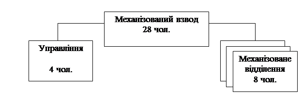 До складу механізованого взводу входять управління взводу та три механізовані відділення. До управління взводу входить командир взводу, заступник командира взводу, кулеметник ПК; номер розрахунку. Всього у взводі налічується 28 чоловік. До мотострілецького відділення як до організаційно-штатної одиниці входять: К — командир відділення. Накази віддає голосом або, перебуваючи у своїй бойовій машині піхоти (БМП), сигналами за допомогою переносної радіостанції (рації). MB — механік-водій БМП. Основне завдання — утримувати у технічно справному стані бойову машину і вміло водити її за будь-яких обставин. НО — навідник-оператор БМП. Озброєний автоматом. Основне завдання — вести вогонь з бортового озброєння. Км — кулеметник. Завдання — вражати групові цілі противника. Гм — гранатометник. Завдання — уражати броньовані цілі противника на відстані до 500 м. СГм — старший гранатометник. ПГм — помічник гранатометника. Основне завдання — переносити гранати, допомагати гранатометникові, прикривати його від вогню противника. Сн — снайпер. Завдання — знищувати важливі цілі противника (офіцерів-спостерігачів, гранатометників). Ст — стрільці. Озброєні автоматами, що мають підствольні протипіхотні гранатомети. Основне завдання — знищувати живу силу противника. ССт — старший стрілець. Особовий склад відділення — від 8 до 10 чоловік, воно має одну бойову машину і засоби радіозв'язку. 2. Озброєння і бойова техніка механізованого взводу на БМП Механізований взвод на БМП озброєний: БМП-2- 3 шт., 5,45 РПК-74 – 3 шт., АК-74 – 15шт., АКС-74у – 3 шт., СВД- 1 шт., РПГ-7-1шт.,ПМ-1шт. Управління: · Командир мв – (ПМ і АКС-74); · Заступник командира взводу – (АК-74); · Снайпер – (СВД); · Стрілець - санітар – (АК-74) Склад механізованого відділення: · Командир відділення – (АК-74); · Гранатометник – (РПГ-7 і АКС-74у); · Помічник гранатометника – (АК-74); · Кулеметник – (РПК-74); · Старший стрілець – (АК-74); · Механік-водій – (АКС-74у); Боєкомплект механізованого відділення: - «Фагот»- 4 шт.; - 30мм патр. – 500шт.; 160-бронебійні; 360-осколочно-фугасні. - 7,62мм патрони – 2000 шт.; - ПГ 7 В – 5 пострілів; - 26мм СП – 12 шт.; - Ф1 – 10 шт. Крім того – 5,45 мм патрони – 1080 (цинк); – 7,62 мм патрони – 2040 (2 цинка). На озброєнні взводу занаходиться бойова машина піхоти (БМП-2) БМП-2 – це бойова гусенична плаваюча машина, що має озброєння, броньований захист й високу маневреність. Вона підвищує мобільність, озброєність та захищеність механізованих підрозділів, що діють на полі бою в умовах можливого застосування ракетно-ядерної зброї. БМП-2здатна слідувати за танками, з ходу долати окопи, траншеї й водні перешкоди, обладнана 10-ма посадочними місцями для розташування й роботи бойового розрахунку у складі: командир відділення (машини); 1 механік-водій; 1 оператор-навідник; 1 стрілки-десантники; 7 Машина озброєна 30-мм автоматичною гарматою 2А-42 з 2-х стрічковим живленням, що стабілізована у 2-х площинах й спареним з нею 7,62-мм кулеметом ПКТ, пусковою установкою для боротьби з броньованими цілями з машини й поза неї. Озброєння дозволяє вести боротьбу з танками, вертольотами та іншими цілями. На машині встановлені пристрої для захисту екіпажу від ЗМУ: - обладнання у середині машини від дії ударної хвилі та проникаючої радіації при ядерному вибуху; - від радіоактивного пороху при русі ураженою місцевістю; - від хімічної та бактеріологічної зброї. Для
