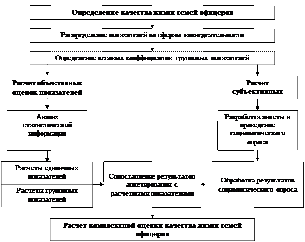 Рис. 1. Концептуальная модель качества жизни семей офицеров Таким образом, качество жизни семей офицеров представляет собой социологическую категорию, выражающую качество удовлетворения потребностей всех ее членов, семьи в целом и имеющую объективную и субъективную стороны. Концептуальная модель качества жизни предполагает анализ таких сфер жизнедеятельности, как трудовая (воинская), потребительская, семейно-родовая и культурно-образовательная. 2. Авторская методика социологического исследования качества жизни семей офицеров. Методика социологического исследования качества жизни семей офицеров представляет собой специальную исследовательскую технологию, включающую комплекс методов сбора и анализа социальной информации, характеризующей качество жизни семей офицеров. Методика предполагает расчет объективных и субъективных показателей, определяемых концептуальной моделью качества жизни семей офицеров (рис. 2).