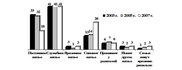 Рис. 3. Сравнительный анализ источников денежных доходов среднестатистической семьи офицера и семей РФ в 2007 году (в руб.) Основной групповой показатель размера доходов – коэффициент обеспеченности семьи офицера в 2007 году составил 2,06. Это означает, что каждый член семьи офицера фактически существует на два далеко не высоких стандарта прожиточного минимума. Анализ материалов проведенного диссертационного исследования наглядно демонстрирует зависимость коэффициента обеспеченности семьи офицера от региона прохожденияслужбы: от 1,84 в соединениях и частях ДВО до 2,52 в ПУрВО. Динамика коэффициента обеспеченности свидетельствует хотя и о медленном, но устойчивом росте жизненного уровня офицерской семьи. Рост индекса удовлетворенности офицеров и их жен своим финансовым положением вырос с «-0,55»[29] в 2003 г. до «-0,49» в 2007 г. Таким образом, качество трудовой сферы семей офицеров характеризуется высокой сплоченностью офицерских коллективов, увеличением возможностей для реализации своих способностей, прежде всего в воинских частях постоянной боевой готовности, незначительным, но постоянным ростом денежных доходов и степени удовлетворенности ими. Доходы семей офицеров, несмотря на свой рост, ниже средних аналогичных показателей по стране. Серьезной проблемой продолжают оставаться такие аспекты трудовой деятельности жен офицеров, как отсутствие возможностей для самореализации и низкая заработная плата. В целях повышения качества жизни органам государственного и военного управления рекомендуется обратить самое пристальное внимание на выполнение условий воинской деятельности, определяемых федеральным законодательством. Качество потребительской сферы жизнедеятельности семей офицеров. Для семей офицеров, по статистическим данным, характернанизкая обеспеченность жильем, причем эта ситуация в течение последних лет имеет тенденцию к стагнации (рис. 4).