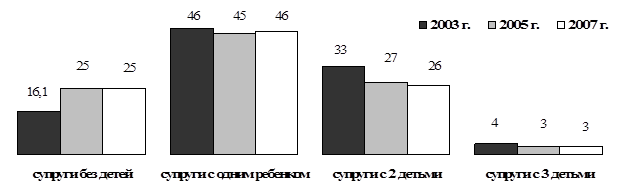 Рис. 4. Характеристика жилищных условий офицерского состава Вооруженных Сил в 2003-2007 гг. (в %) Ярким подтверждением этого является динамика индекса удовлетворенности жилищными условиями. В отличие от других индексов удовлетворенности (размер денежных доходов, удовлетворенность службой в целом) он не меняется. Как и в 2003 году, в 2007 году он колебался в границах от «-0,22» до «-0,21». Наиболее низкое значение индекс удовлетворенности имеет в Калининграде («-0,49»), Санкт-Петербурге («-0,41») и Москве («-0,32»). Результаты проведенных исследований свидетельствуют о ряде других нерешенных проблем семей офицеров в этой сфере. Среди них – несоответствие размеров жилых помещений социальным нормам (12 кв.м. общей площади на одного члена семьи), снижение качества технического состояния жилых помещений и др. Анализ характеристики структуры расходов семей офицеров свидетельствует о ее деформации. Доля расходов на продукты питания продолжает оставаться основной статьей семейных расходов (28%). За 2005–2007 годы повысились расходы семьи на оплату услуг жилищно-коммунального хозяйства и поднайма жилья. Стабильно растут расходы семей офицеров на обучение детей и услуги в области здравоохранения. Таким образом, качество потребительской сферы семей офицеров характеризуется имущественным положением, соизмеримым с положением в целом по стране. Вместе с тем сама структура расходов семей офицеров деформирована, преобладают расходы на питание и оплату услуг ЖКХ. Для семей офицеров характерна низкая обеспеченность жильем, которая усугубляется ухудшением технического состояния жилых помещений. В целях повышения качества жизни рекомендуется приоритет в потребительской сфере отдать вопросам обеспечения семей офицеров жильем и ремонту уже имеющих жилых помещений. Качество семейно-родовой сферы жизнедеятельности семей офицеров . Самая распространенная по составу семья офицера – супружеская пара с одним ребенком (рис. 5), что позволяет оценивать демографическую ситуацию в данной социальной группе как неблагополучную.