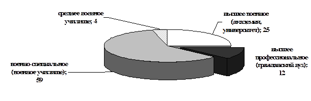 Рис. 5. Динамика изменения размеров семей офицеров в 2003-2007 гг. (в %) Вместе с тем семьи офицеров отличает высокая степень удовлетворенности супругов своими отношениями, которая свидетельствует о прочности и надежности армейской семьи. Анализ полученных результатов показывает, что большинство мужчин – офицеров (80%) и женщин – жен офицеров (72%) в целом удовлетворены семейными отношениями. Среди семей офицеров выявлено не так много супружеских пар с высоким уровнем конфликтности – около 10%, гораздо чаще конфликты случаются иногда (у 25% семей). Главные причины конфликтов, по мнению мужчин, – несогласованность в воспитании детей, распределении домашней работы, по мнению женщин – плохие бытовые и жилищные условия, материальные трудности. Касаясь состояния своего здоровья, большинство офицеров (89%) характеризуют его как удовлетворительное, хорошее или отличное. Почти каждый десятый офицер испытывает серьезные трудности со здоровьем. Подобная ситуация имеет место на протяжении последних четырех лет наблюдения. Жены офицеров оценивают свое здоровье менее оптимистично, только 68% считают его удовлетворительным. Качество лечения, получаемого в военных медицинских учреждениях, устраивает менее половины офицеров. Таким образом, анализ качества семейно-родовой сферы жизнедеятельности семьи офицера свидетельствует о высокой степени удовлетворенности супругов выбором брачного партнера. Абсолютное большинство офицеров оценивают состояние своего здоровья как удовлетворительное, отмечая в целом доступность своего лечения в медучреждениях Минобороны. Вместе с тем демографическая ситуация в семьях офицеров неблагополучна и имеет тенденцию к ухудшению. В отличие от мужей, жены менее оптимистичнооценивают состояние своего здоровья, серьезной проблемой для многих из них является доступность лечения в военных поликлиниках. Взрослые члены семей отмечают общее падение уровня лечения в военно-медицинских учреждениях. Рекомендуется проявлять заинтересованность в укреплении семьи, повышать ее роль и значение семейных ценностей во всех сферах жизнедеятельности Вооруженных Сил. Качество культурно-образовательной сферы жизнедеятельности семей офицеров. Офицерский состав традиционно обладает высоким образовательным уровнем. Каждый четвертый офицер окончил академию, почти две трети являются выпускниками высших военных училищ (рис. 6). В целом, с учетом числа выпускников гражданских вузов, высшее образование имеют 96% офицерского состава (в 2003 г. – 92%). Значительно (в два раза по сравнению с 2003 годом) увеличилось количество офицеров, окончивших гражданские вузы. Многие из них добросовестно служат, но в целом впечатление о них в войсках отрицательное: отсутствует инициатива, превалирует желание уволиться из рядов Вооруженных Сил.