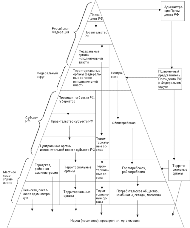 Центросоюз, как разветвленная и устоявшаяся система организаций приводится в данной схеме для примера, таким примерно статусом для целей данной схемы могли бы стать и учреждения Центрального банка России, Академии наук и учреждения ряда других органов власти в Российской Федерации. В представленной схеме отношения власти и подчинения естественно видны в связях вертикали власти между федеральными органами Российской Федерации на уровне Федерации, территориальными органами федеральных органов исполнительной власти и дальше вплоть до цели существования административного аппарата (управления населением), - между органами федеральной исполнительной власти на местах и гражданами. Подобной вертикали мы не видим в левой части схемы, в которой отражено современное состояние статуса субъектов Российской Федерации: вертикаль власти прерывается на уровне между федеральными органами исполнительной власти и центральными органами власти субъекта Российской Федерации, второй раз эти связи прерываются на уровне между органами власти местного самоуправления и населением. В последнем случае они прерываются в силу объявленного в Конституции РФ 1993 года негосударственного характера органов местного самоуправления. Реальность не соответствует Конституции и потому противоправна, или же Конституция не соответствует реалиям жизни. Дело не только в том, что фактически органы местного самоуправления действуют на основании “делегирования” им функций государственных органов, дело в том, что характер отношений в государстве, если оно не коммунистическое, внегосударственное, всегда является властным, так как все, в том числе и местные отношения управления вписаны во всеобщее разделение труда в государстве и ни один элемент не может выпасть из этих отношений властвования государства без отрицания самого государства. И федеральная, и муниципальная - это одна и та же служба, государственная. Только ее разновидности. Во Франции местная служба является государственной службой[См., например: Местная государственная служба во Франции: Организация и общий статус. – М.: Издание посольства Франции в Москве, 1993.]. В Великобритании государственная служба имеет несколько разновидностей: гражданская, военная, местная, полицейская, дипломатическая, но все это государственная служба. Все они выполняют функции регулирования общественных интересов в классовом государстве. Цель классового расслоения общества в Российской Федерации вместо коммунистического равноправия в СССР провозглашена в ельцинский период: создать средний класс в бесклассовом коммунистическом обществе времен СССР. При этом законодательство антикоммунистического государства даже под лозунгами буржуазной демократии теоретически не должно было бы допускать переименования государственных форм организации общества в негосударственные. Здесь видна концептуальная двусмысленность Конституции РФ 1993 года. Однако, надо отметить, что нерешенность этого теоретического, концептуального вопроса о понятии государства и соотношении его организации с коммунистическим внегосударственным самоуправлением народа являются до сих пор предметом борьбы, по сути за государственность. Заключение Итак, существует две основные точки зрения касаемые вопроса о разграничении муниципа