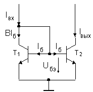 Пример. В дифференциальном каскаде использованы транзисторы с сопротивлением эмиттера rэ = 250 Ом. Сопротивления резисторов Rк =Rэ =75 кОм. В этом случае Кдиф =150, Ксинф =0,5, КОСС=300. При питании от источников +/-15 В ток покоя цепей коллекторов равен 100 мкА при напряжении на коллекторах относительно общей точки 7,5 В. Повысить параметры дифференциального усилителя в принципе можно простым увеличением сопротивлений резисторов RК и RЭ , но при этом уменьшится ток покоя транзисторов и, как следствие, ухудшится температурная и временная стабильность усилителя. Эффективный путь улучшения характеристик усилителя состоит в замене линейных резисторов источниками тока, обладающими высоким динамическим сопротивлением при достаточно больших токах. В частности, в качестве динамической нагрузки в цепи коллекторов транзисторов дифференциального усилителя широко используется так называемое токовое зеркало (рис 1.3). При таком включении UКЭ =UБЭ >UКЭ.нас . Следовательно, транзистор Т1 ненасыщен. Поскольку UБЭ1 =UБЭ2 , то при хорошо согласованных по параметрам транзисторах IБ1 =IБ2 =IБ и IК1 =IК2 =BIБ , где B - статический коэффициент передачи тока. При этом IВХ = BIБ +2IБ и IВЫХ = BIБ Отсюда следует, чтоIВЫХ = BIВЫХ /(B+2).