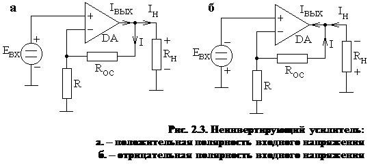 Неинвертирующий усилитель. Усилитель, рис. 2.3 не инвертирует входной сигнал. В отличие от инвертирующего, неинвертирующий усилитель обладает большим входным сопротивлением. Согласно правилам 1 и 2 ток в цепи обратной связи I=ЕВХ /R и создает падение напряжения на резисторе RОС равное ЕВХ RОС /R. Учитывая, что выходное напряжение складывается из падений напряжений на резисторе RОС и R можно записать: