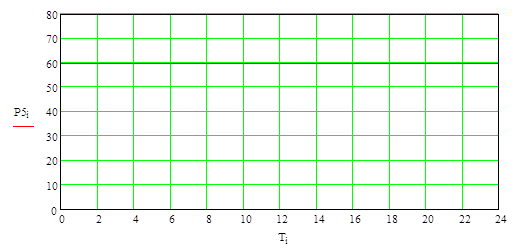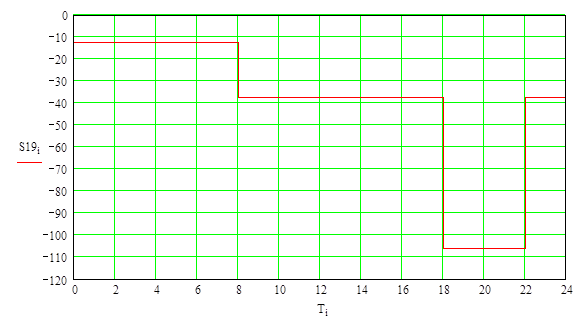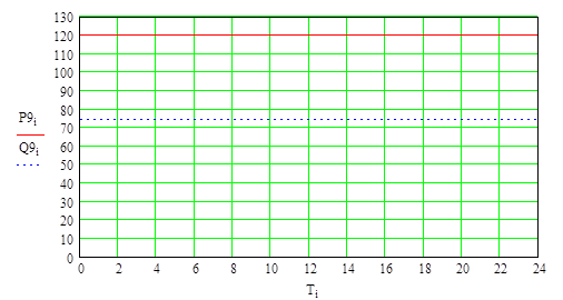 Графік активного навантаження трансформаторів на стороні НН в цьому режимі визначаємо як різницю графіків активної потужності (рисунок 1.9 і 1.2), реактивного навантаження – як різницю графіків реактивної потужності (рисунок 1.9 та 1.7). Побудова даних графіків проводиться на рисунках 1.10 та 1.11. Потім по них побудуємо графік повного навантаження трансформаторів на стороні НН (рисунок 1.12). У випадку аварійного відключення одного із генераторів при ремонті другого в літній період вся потужність, яка необхідна споживачам генераторної напруги, поступає із системи. Тому графік навантаження трансформаторів зі сторони НН в цьому режимі збігається з літнім графіком навантаження споживачів генераторної напруги, але береться з оберненим знаком, так як потужність видається із системи (рисунок 1.13). Та оскільки у даному курсовому проекті встановлено три генератори на стороні НН, то даний графік буде побудований як різниця максимальної потужності генератора, що залишився в роботі, і навантаження споживачів генераторної напруги (рисунок 1.2). Такиам чином, навантаження трансформаторів на стороні НН в різних режимах визначається графіками рисунок 1.4, 1.6, 1.12, 1.13. Для визначення навантаження трансформаторів на стороні найбільшої напруги (ВН) необхідно від цих графіків навантаження споживачів на стороні середньої напруги 110 кВ (СН) (рисунок 1.3, 1.8). Відповідні побудови приведені на графіках рисунок 1.14, 1.19, причому для режиму аварії в системі, графіки будуються для активних, реактивних, а потім повних потужностей, а для решти режимів – тільки для активних потужностей. Побудову графіків навантаження трансформаторів на різних напругах проводимо за допомогою комп’ютерної програми MathCAD.