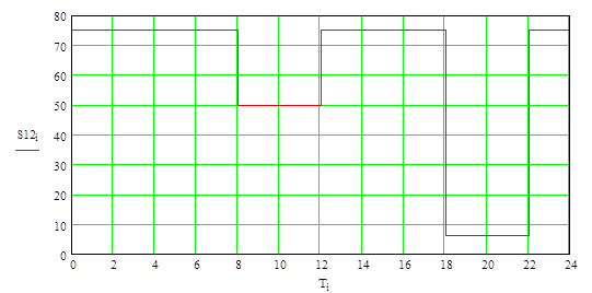 Рисунок 1.20 – Графік повного навантаження трансформаторів зі сторониВН при аварії в системі Після побудови графіків навантаження, робиться вибір потужностей трансформаторів, причому необхідно врахувати можливість перевантаження трансформаторів, керуючись наступними правилами: 1) в аварійному режимі допускається перевантаження на протязі не більше 5 діб на 40% зверх мінімальної потужності, на час максимумів навантаження не більше 6 годин на добу, якщо коефіцієнт початкового навантаження не більше ніж 0.95; 2) в інших випадкахнеобхідно користуватися графіками переван- тажувальної здатності трансформаторів, встановленими ГОСТ 14209-85П. Для цього дійсний графік навантаження перетворюється в двоступеневий, причому еквівалентне навантаження кожного ступеня визначається як:
