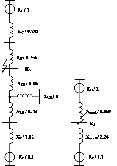 Рисунок 3.5 – Розрахункова схема струмів КЗ в т. К-3 Знаходимо надперехідне значення струму КЗ в точці К-3: