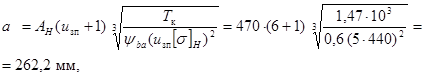де AH =470 - коефіцієнт, що приймається для шевронної передачі; yba =0,6 - коефіцієнт ширини зубчастого вінця. Назначається число зубів шестерні Zш1 = 18 і кут нахилу зубів β =20°. Число зубів колеса Zк = Zш uзп = 18×6 = 108. Модуль зачеплення