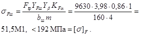Визначається коефіцієнт Визначається коефіцієнт Yβ, що враховує вплив кута нахилу зуба на згинальні напруження: Yβ = 1 - β˚ / 140 = 1 – 20 / 140 = 0,86. Визначається коефіцієнт KFα, що враховує нерівномірність розподілу навантаження між парами зубів у зоні двопарного зачеплення. Для шевронної передачі при ступіні точності Ст1 = 9 KFα = 1. Розрахункові напруження згину в зуб’ях шестерні