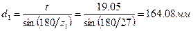 Розрахунок геометричних параметрів ланцюгової передачі - крок ланцюга t = 19,05 мм ; - діаметр ролика ланцюга d 1 = 11,91 мм ; - число зубців ведучої зірочки z 1 = 27 , ведомої – z 2 = 81 ; - діаметр ділильної окружності ведучої зірочки d д1 = 164,093 мм , ведомої – d д2 = 491,3 мм - діаметр окружності виступів