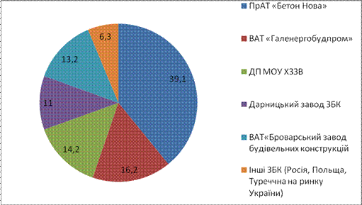 ![]() Рис. 1.1 Зміна обсягів ринку ЗБВ в Україні протягом 2006-2010 рр. Позитивні зрушення намітилися і в сегменті ЗБК для енергетичної галузі. Показники минулого року свідчать про подолання основних кризових явищ в даному сегменті і про стабілізацію ситуації. Слід зазначити, що особливість роботи великих промислових виробників ЗБК для енергетичної галузі полягає в тому, що основні обсяги замовлень формуються підприємствами-споживачами протягом попереднього року. Тому планові обсяги виробництва 2010 року відповідні фактичному, перш за все фінансовому рівню замовників станом на кінець 2009 року. [16] На українському ринку товарного бетону та залізобетонних виробів і конструкцій працюють понад 300 операторів. Серед провідних гравців можна виділити групу Ковальської (ВАТ «Завод залізобетонних конструкцій ім. С. Ковальської», ТОВ «Бетон Комплекс» і ТОВ «Бетон Сервіс»), Дарницький завод ЗБК, ЗАТ «Об'єднання«Дніпроенергобудпром», ВАТ«Броварський завод будівельних конструкцій»та ін. Кожен завод займає невелику частку ринку, 1-3% від спільного ринку України. Що стосується сегменту енергетичного залізобетону, то тут лідерами вітчизняного ринку виступають ПрАТ «Бетон Нова» (Донецька обл.), ВАТ «Галенергобудпром» (Львівська обл.) та ДП МОУ ХЗЗВ (Харківська обл.). «Обсяг виробленої продукції у всіх підприємств приблизно однаковий. Лідери ринку визначилися вже давно, і за останній час істотних змін у складі його провідних учасників не спостерігалося. Розподіл ринку енергетичного залізобетону представлено на рис. 1.2
