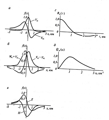 Из этих равенств видно, что в двухмерной задаче энергетические спектры и автокорреляционные функции аномалий H, Z или гравитационных Vxz , Vхх , Vzz полностью взаимозаменяемы. Некоторые из них показаны на рис. 6. Это же положение верно в двухмерном случае и для аномалий Vх , Vz , т.е. для горизонтальной и вертикальной производных от любой исходной одной и той же аномалии. Оно же верно и для аномалий H, Z в случае косого и вертикального намагничивания и для нормированных функций Q и B аномалий H, Z и ΔT. Это важное свойство автокорреляционных функций и энергетических спектров. Им не обладают исходные гравитационные и магнитные аномалии, за исключением функций Vxz , Vхх , Vzz в трехмерном случае и Vхх и Vzz — в двухмерном, для которых указанное свойство следует из уравнения Лапласа. Легко показать, что энергетический спектр аномалии является всегда вещественной и четной функцией. Тогда и автокорреляционная функция аномалии будет вещественной и четной функцией. Рассмотрим взаимные энергетические спектры Q12 (ω) и Q21 (ω) двух функций f1 (x) и f2 (x). Для них верны соотношения