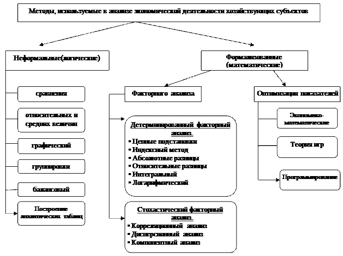 Рисунок 3. Этапы системного подхода в анализе хозяйственной деятельности. Таким образом, метод АХД представляет системное, комплексное изучение, измерение и обобщение влияния факторов на результаты деятельности предприятия путем обработки специальными приемами системы показателей плана, учета, отчетности и других источников информации с целью повышения эффективности производства. 1.3. Методика АХД : понятия, виды. Использование метода АХД проявляется через ряд конкретных методик аналитического исследования. Это могут быть методики исследования отдельных сторон хозяйственной деятельности либо методики комплексного анализа. Надо отметить, что каждому виду анализа соответствует своя методика. Под методикой [12] понимается совокупность способов, правил наиболее целесообразного выполнения какой-либо работы. В экономическом анализе методика представляет собой совокупность аналитических способов и правил исследования экономики предприятия, определенным образом подчиненных достижению цели анализа. Общую методику понимают как систему исследования, которая одинаково используется при изучении различных объектов экономического анализа в различных отраслях национальной экономики. Частные методики конкретизируют общую относительно к определенным отраслям экономики, к определенному типу производства или объекту исследования. Любая методика анализа будет представлять собой наказ или методологические советы по исполнению аналитического исследования. Она содержит такие моменты, как: а) задачи и формулировки целей анализа; б) объекты анализа; в) системы показателей, с помощью которых будет исследоваться каждый объект анализа; г) советы по последовательности и периодичности проведения аналитического исследования; д) описание способов исследования изучаемых объектов; е) источники данных, на основании которых производится анализ и т.д. В качестве важнейшего элемента методики АХД выступают технические приемы, и способы анализа, о чем будет рассказано в следующей главе. 2.КЛАССИФИКАЦИЯ МЕТОДОВ И ПРИЕМОВ ЭКОНОМИЧЕСКОГО АНАЛИЗА 2.1.Общая классификация методов экономического анализа. Существует множество классификаций методов и приемов экономического анализа, в основе которых лежат различные признаки. Одним из наиболее информативных, по мнению автора данной курсовой работы, является деление приемов и методов по степени их формализуемости, т.е. в зависимости от того, в какой степени описывается данный метод с помощью математических процедур. С этой точки зрения, все методы могут быть подразделены на неформализованные и формализованные. Неформальные или логистические методы (вероятно, правильнее их назвать трудно формализуемыми) основаны на описании процедур на логическом уровне, без помощи строгих аналитических зависимостей. Большую роль в применении этих методов играют опыт и интуиция, аналитика. К этой группе относятся следующие методы: · сравнения · относительных и средних величин · графического и табличного представления данных · группировки · балансовый Формализованные методы (иногда их еще называют математическими) опираются на предварительно заданные строгие зависимости и правила. Не все из них равнозначны по сложности используемого математического аппарата, возможности реализации в практической дея