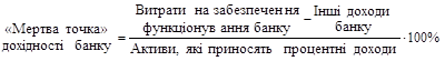 "Мертва точка" дохідності дає змогу визначити мінімальний розрив у відсоткових ставках за активними і пасивними операціями, який покриває загальні витрати банку, але не приносить доходу. Вона встановлює мінімальний рівень дохідності, який необхідно витримувати банку під час проведення активних операцій для покриття його загальних витрат.