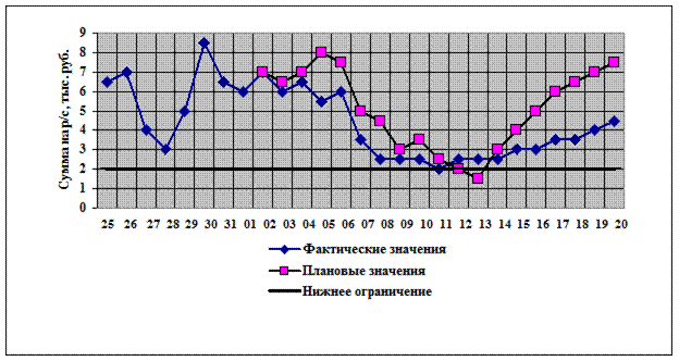Рис. 2.2. Динамика фактического состояния р/с до 2 числа и планового до 20 числа На рисунке 2.1 показана ситуация на 2-е число месяца: а) текущее состояние расчетного счета - 7 тыс.руб.; б) на 3-е число запланирован расход 2,5 тыс. и ожидается приход 2 тыс. (останется 6,5 тыс.); в) на 4-е число, соответственно 5 и 6 тыс.руб. (остаток 7 тыс.) и т.д. на планируемый период. Рис. 2.3. Ситуация на 20 число. График плановых и фактических сумм на расчетном счете На данном рисунке отражена ситуация на 20-е число месяца. Имеющиеся данные позволяют сравнить плановую и фактическую динамику изменения состояния расчетного счета и их приближение к критическому уровню. На графике видно критическое уменьшение 13-го планового значения суммы на расчетном счете. Это позволяет, в случае необходимости, изменить планы или оставить их без изменения, если это оправдано какими-либо причинами. Рассмотрим основные функции подсистемы. Задание значений плановых показателей. Необходимо создать механизм для описания планируемых дебета и кредита бухгалтерских счетов (плановое сальдо счета вычисляется исходя из дебета и кредита) и предусмотреть возможность автоматического разнесения плановых показателей, на субсчета исходя из общей цифры, заданной пользователем на счете. Например, планируются общепроизводственные затраты на будущий месяц. В настройках задано, что 20% этих затрат необходимо запланировать на рекламу, 30% - на зарплату, 15% - на подарки и т.д. Поскольку указанные статьи затрат являются субсчетами общего затратного счета, необходим механизм, который, при задании плана по общему счету затрат, запланирует затраты по каждому субсчету, соответствующие указанным процентам. Задание допустимых значений показателей. Необходимо создать механизм для задания допустимых значений показателей (дебета, кредита и сальдо счета) по каждому счету (субсчету) на определенный период времени. Пример зависимости граничного значения от времени: верхнее граничное значение дебета затрат на рекламу в период после новогодних и рождественских праздников значительно ниже, чем до этих праздников. В данном примере описано ограничение дебета счета. Если же мы укажем, что конечное сальдо на этом счете не должно превышать некую сумму, мы тем самым ограничим абсолютную сумму затрат на рекламу в указанном периоде. Граничные значения некоторых показателей нельзя оговаривать безотносительно периода группировки по временному промежутку. Например, если мы говорим, что в период дат с Д1 по Д2 на рекламу нельзя тратить более суммы С, мы должны сказать за какой период: за день, неделю, месяц, весь указанный период. Это означает, что и сравнительные отчеты необходимо запускать с аналогичным параметром группировки по периоду: сгруппировали затраты по месяцам и сравниваем с граничными показателями затрат оговоренными на месяц. Мониторинг динамики плановых показателей и сравнение их с допустимыми значениями . Механизм отчетов и графиков по бухгалтерским счетам, при отображении текущих и плановых показателей, должен сравнивать эти показатели с граничными и, в случае выхода показателей за допустимые пределы, информировать пользователя, отображая их другим цветом. Логично предположить, что граничные значения планового показателя и фактического значения - одинаковы, тем более, что нет механизма, позволяющего в