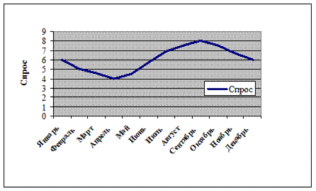 Рис. 2.9. Гипотетическая кривая спроса Под стратегией преследования (удовлетворения спроса) понимается производство объема, необходимого в данный момент. Уровень материально-производственных запасов остается одинаковым, а объем производства изменяется в соответствии с уровнем спроса. Эта стратегия представлена ниже (Рис. 2 .10).