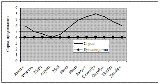Рис. 2.10. Стратегия удовлетворения спроса Организация производит объем товаров, которого как раз достаточно для удовлетворения спроса в данный момент времени. В некоторых отраслях возможно использовать только эту стратегию. Например, сельскохозяйственные организации производят товары в период, когда возможно ее выращивание. В ресторанах обязаны подавать блюда, когда посетители их заказывают. Такие организации не могут делать запасы и накапливать продукцию, они должны удовлетворять спрос тогда, когда он возникает. В этих случаях организации должны обладать достаточной производительностью, чтобы иметь возможность удовлетворить пиковый спрос. Сельскохозяйственным организациям необходимо иметь достаточное количество механизмов и оборудования, чтобы собрать урожай летом, хотя зимой это оборудование будет бездействовать. Предприятия вынуждены нанимать и обучать сотрудников для работы в периоды максимальной нагрузки, а по истечении этого срока увольнять их. Иногда приходится вводить дополнительные смены и работу в сверхурочное время. Все эти изменения повышают себестоимость. Преимущество стратегии преследования заключается в том, что объем материально-производственных запасов может быть минимальным. Товар производится, когда на него появляется спрос, и не накапливается. Таким образом, удается избежать расходов, связанных с хранением материально-производственных запасов. Равномерное производство. При равномерном производстве постоянно производится объем продукции, равный среднему спросу. Это соотношение отображено на рисунке (Рис. 2 .11.) Организации рассчитывают общий спрос на планируемый период времени и в среднем производят достаточный объем товаров для удовлетворения этого спроса. Иногда спрос оказывается меньше произведенного объема, в этом случае накапливаются запасы готовых товаров. В другие периоды спрос превышает объем производства, тогда эти запасы товаров используются.