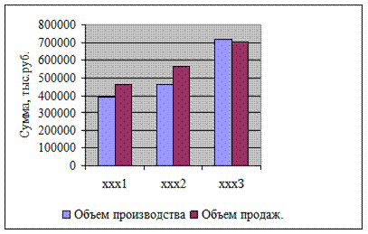 Из данных таблицы видно, что на основе базисных темпов роста за два года мы можем судить о том, что объем производства увеличился на 55,3%, а объем продаж на 41,97%. Цепные темпы роста показывают, что в ххх2 году объем производства увеличился относительно предыдущего года на 18,11%, а в хххЗ году на 31,49% относительно ХХХ2 года. Наглядно эти процессы представлены на рисунке 5.1.