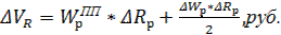 Зависимость объема производства товаров от данных факторов можно описать с помощью мультипликативной модели: V = R * W , V 0 = R 0 * W 0 = 20 *146 = 2920 (тыс.руб.) Тогда влияние изменения величины количества работников на обобщающий показатель можно рассчитать по формуле: V усл1 = R 1 * W 0 = 25 *146 = 3650 (тыс.руб.), ∆ V усл1 = V усл1 - V 0 = 3650 - 2920 = 730 (тыс.руб.). Далее определим влияние изменения выработки работников на обобщающий показатель: V 1 = R 1 * W 1 = 25 *136 = 3400 (тыс.руб.), ∆ V усл2 = V 1 - V усл1 = 3400 - 3650 = - 250 (тыс.руб.). Таким образом, на изменение объема производства товаров положительное влияние оказало изменение на 5 человек численности работников, что вызвало увеличение объема производства на 730 тыс.руб., и отрицательное влияние оказало снижение выработки на 10 тыс.руб., что вызвало снижение объема на 250 тыс. руб. Суммарное влияние двух факторов привело к увеличению объема производства на 480 тыс. руб. Преимущества данного способа: универсальность применения, простота расчетов. Недостаток метода состоит в том, что, в зависимости от выбранного порядка замены факторов, результаты факторного разложения имеют разные значения. Это связано с тем, что в результате применения этого метода образуется некий неразложимый остаток, который прибавляется к величине влияния последнего фактора или распределяется между влиянием всех качественных факторов. На практике точностью оценки факторов пренебрегают, выдвигая на первый план относительную значимость влияния того или иного фактора. Однако существуют правила, определяющие последовательность подстановки: - при наличии в факторной модели количественных и качественных показателей в первую очередь рассматривается влияние количественных факторов; - если модель представлена несколькими количественными и качественными показателями, последовательность подстановки определяется путем логического анализа. Способ абсолютных разниц является модификацией способа цепной подстановки. Изменение результативного показателя за счет каждого фактора способом разниц определяется как произведение отклонения изучаемого фактора на базисное или отчетное значение другого фактора в зависимости от выбранной последовательности подстановки: y0 = a0 * b0 * c0 ; ∆ya = ∆a * b0 * c0 ; ∆yb = ∆b* a1 * c0 ; (1.0) ∆ y с = ∆с* a 1 * b 1 ; y 1 = a 1 * b 1 * c 1 ; ∆ y = ∆ ya * ∆ yb * ∆ yc . Способ относительных разниц применяется для измерения влияния факторов на прирост результативного показателя в мультипликативных и смешанных моделях вида у = (а – в)* с. Он используется в случаях, когда исходные данные содержат определенные ранее относительные отклонения факторных показателей в процентах. Для мультипликативных моделей типа у = а * . в. * с методика анализа следующая: - находят относительное отклонение каждого факторного показателя: