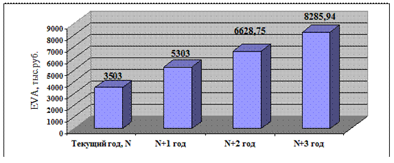 Логика показателя EVA заключается в следующем: чистая операционная прибыль после налогообложения (NOPAT) - это доход, полученный после вычитания расходов и амортизации. Часть данного дохода идет на оплату расходов за пользование ресурсами (выражается в затратах на собственный и заемный капитал), а другая часть составляет созданную стоимость, которую измеряет EVA (Таблица 9 .204). Таблица 9.204 Расчет экономической добавленной стоимости для исследуемой организации при горизонте планирования 3 года