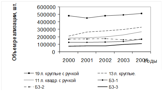 Рис. 2.1 Динамика реализации продукции за 2000 – 2004 г.г. Как видно из графика объема реализации за изучаемый период, рост наблюдается во всех товарных группах, но в группе БЗ-2 в 2003 году наблюдается спад, но уже в 2004 году наметилась тенденция к росту. Лидером по росту объемов является товарная группа 13-ти литровых, 11-ти литровых квадратных бутылей, темпы роста которых составили 156,08 и 147,11 % соответственно, незначительно отстают от них БЗ-3 (143,68 %). Изучая причины данного явления, можно отметить, что основными факторами, вызвавшими рост, являются: востребованность данного вида продукции у потребителей и своевременная реакция производства, сумевшего уловить данную тенденцию выпустить требуемый товар. Данные по валовой прибыли на примере 2004 года, приведенные в таблице 2.3, позволяют определить, какие товарные группы являются наиболее выгодными. Таблица 2.3 Экономические показатели ООО «Ххх» в 2004 году по товарным группам