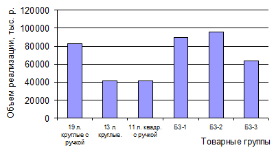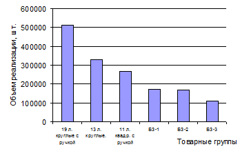 Рис 2.2 Объем реализации продукции в 2004 году в натуральных показателях Как видно, наибольший объем реализации наблюдается в товарной группе поликарбонатных бутылей: 19-ти литровых, затем следуют бутыли 13-ти литровые круглые, немного отстают 11-ти литровые квадратные бутыли. Наименьшие показатели в группе стальных бочек. На рис. 2.3 графически представлены данные по выручке от реализации по каждой группе товаров. Как видно, большая часть выручки принадлежит стальным бочкам, это объясняется их высокой ценой.
