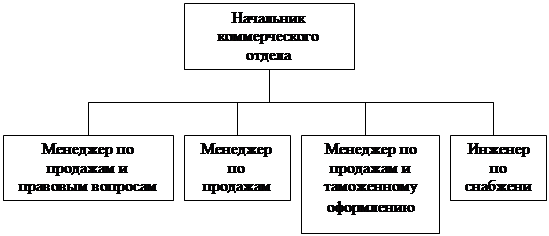 Рис. 3.1. Современная структура управления коммерческого отдела. Основной задачей начальника коммерческого отдела является материально-техническое обеспечение производства, хранение и сбыт производимой продукции. В своей работе он руководствуется законодательством РФ, внутренними приказами, распоряжениями руководства предприятия, нормативно-методическими материалами по снабженческо-сбытовой деятельности; должностной инструкцией (приложение 3). В подчинении начальника коммерческого отдела находятся специалисты коммерческого отдела, транспортного участка, склада. Начальник коммерческого отдела планирует, организует, координирует и контролирует деятельность отдела, транспортного участка и склада для максимально эффективного использования ресурсов предприятия. Кроме того, должен постоянно изучать перспективы спроса на выпускаемую продукцию, находить рынки сбыта, проводить маркетинговые исследования, а также, должен предоставлять менеджеру по правовым вопросам предприятия списки дебиторов, взыскание задолженностей с которых необходимо осуществлять через Арбитражный суд. Менеджер по продажам и правовым вопросам относится к категории специалистов предприятия, имеет высшее юридическое образование. В своей деятельности руководствуется законодательством РФ; внутренними приказами, распоряжениями руководства предприятия; должностной инструкцией. В его задачи входит осуществление сбыта продукции предприятия; обеспечение и защита правовых интересов предприятия. Должен изучать перспективы спроса на выпускаемую предприятием продукцию; находить рынки сбыта, проводить маркетинговые исследования; принимать меры по расширению хозяйственной самостоятельности предприятия; своевременное заключение договоров с поставщиками и потребителями, расширение хозяйственных связей; организовывать с участием структурных подразделений предприятия работу по своевременному и правовому заключению хозяйственных договоров; учёт выполнения договорных обязательств, применение экономических мер воздействия при невыполнении обязательств; вести претензионно-исковую работу. Менеджер по продажам также относится к категории специалистов предприятия, имеет высшее образование. В его задачи входит материально-техническое обеспечение производства; хранение и сбыт производимой продукции. Должен участвовать в хозяйственно-финансовой деятельности предприятия в области материально-технического снабжения, заготовки и хранения сырья, сбыта продукции по договорам поставки, транспортного обслуживания; содействовать эффективному использованию материальных и финансовых ресурсов; снижать их потери, ускорить оборачиваемость оборотных средств; принимать меры по расширению хозяйственной самостоятельности предприятия, своевременном заключении договоров с поставщиками и потребителями, расширении хозяйственных связей; постоянно изучать перспективы спроса, проводить маркетинговые исследования, обеспечивать и контролировать работу предприятия со службой железной дороги. Менеджер по продажам и таможенному оформлению относится к категории специалистов предприятия, имеет высшее образование. Его задачи те же, что и у предыдущего специалиста, плюс то, что он должен обеспечивать непосредственное взаимодействие со службой Вол