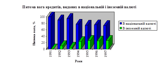 Аналізуючи дані таблиці 4 можна зробити висновок, що з плином часу питома вага кредитів, виданих в національній валюті зменшується, а в іноземній зростає. Це можна пояснити нестабільністю національної валюти і недовірою до неї з боку українських банкірів. Таблиця 5.