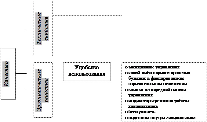 В перспективе предприятие планирует расширять рынки сбыта. В связи с тем, что любое маркетинговое исследование не может быть целенаправленным без уточнения того какой товар производить, необходимо произвести анализ целесообразности выпуска соответствующего товара. 4.1 Трехуровневый анализ товараПри проведении исследования товар в первую очередь оценивается как потребительская ценность, т.е. найдут ли заложенные в продукции свойства и качества спрос на рынке. В подавляющем большинстве потребности удовлетворяются товарами - изделиями, каждое из которых характеризуется тремя основными свойствами: o предназначается для удовлетворения определенных потребностей; o производится некоторыми производителями для продажи; o приобретается потребителем посредством покупки по свободной рыночной цене. Товары принято делить на потребительские товары и товары производственного назначения. Холодильник может быть как товаром народного потребления (товар предварительного выбора), так и товаром производственно-технического назначения (капитальное имущество). I уровень. Описание сущности товара. Пищевые продукты при хранении могут подвергаться порче под влиянием кислорода воздуха и солнечного света, недостаточной или чрезмерной влажности воздуха. Однако основными причинами порчи являются микробиологические и биохимические факторы. Одним из эффективных и распространенных средств сохранения качества продуктов являются понижение их температуры, при которой снижаются жизнедеятельность микроорганизмов и активность тканевых ферментов, что замедляет как естественные процессы, протекающие в продуктах (автолиз мяса, дыхание и дозревание плодов и др.), так и реакции, вызываемые жизнедеятельностью микроорганизмов. Таким образом, холодильник удовлетворяет потребность человека в свежей пище. Охлаждение пищевых продуктов широко применяется при заготовке различных продуктов питания, при транспортировке скоропортящихся продуктов и т.д. В настоящее время практически все имеют у себя дома холодильник. II уровень. Описание фактического товара. Холодильник Stinol характеризуется множеством различных параметров, которые можно представить в виде «дерева качества». Построение будем вести с учетом общепризнанных групповых показателей качества. К ним относятся: - технические показатели, характеризующие технический уровень продукции, ее свойства (надежность, долговечность, технологичность, безотказность, ремонтопригодность и другие). - эргономические показатели, характеризующие продукцию с точки зрения ее соответствия особенностям человеческого организма. - эстетические показатели, характеризующие внешнюю форму ^изделия (выразительность, эмоциональность, привлекательность и т.д.) - показатели назначения , описывающие технические свойства изделия. - экологические показатели, характеризующие соответствие продукции требованиям по защите окружающей среды (содержание вредных примесей в обработанных веществах, выброс вредных веществ в атмосферу, слив отходов производства в воду и другие).