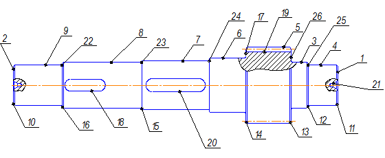 Рис. 2.1 – Эскиз детали с позициями поверхностей 005 Заготовительная 1. Штамповка на ГКМ 010 Термическая 1. Отжиг 015 Фрезерно-центровальная (МР-73) А. Установить и снять заготовку 1. Фрезеровать торцы 2. Сверлить центровые отверстия В6,3 020 Токарно-винторезная (черновая) (16К20) А. Установить и снять заготовку 1. Точить пов. 9 начерно 2. Точить пов. 8 начерно 3. Точить пов. 7 начерно 4. Точить пов. 6 начерно 5. Точить торец 17 начерно Б. Переустановить заготовку 6. Точить пов. 4 начерно 7. Точить пов. 3 начерно 8. Точить пов. 5 начерно 9. Точить торец 26 начерно 025 Токарно-винторезная (чистовая) (16К20) А. Установить и снять заготовку 1. Точить пов. 4 начисто 2. Точить торец 26 начисто 3. Точить пов. 5 начисто 4. Точить фаску 11 однократно 5. Точить канавку 13 однократно 6. Точить канавку 25 однократно Б. Переустановить заготовку 7. Точить пов. 9 начисто 8. Точить пов. 8 начисто 9. Точить пов. 7 начисто 10.Точить торец 17 однократно 11.Точить фаску 10 однократно 12.Точить фаску 16 однократно 13.Точить фаску 15 однократно 14.Точить фаску 14 однократно 15.Точить канавку 22 однократно 16.Точить канавку 23 однократно 17.Точить канавку 24 однократно 030 Вертикально-фрезерная (6Р11) А. Установить и снять заготовку 1. Фрезеровать шпоночный паз 18 2. Фрезеровать шпоночный паз 20 035 Зубофрезерная (53А20) А. Установить и снять заготовку 1. Фрезеровать 29 зубьев m=4 ст. 9-В 040 Термическая (печь индукционная) 1. Улучшить 2. Закалить зубья ТВЧ на 1,5…2 мм 045 Слесарная (верстак слесарный) 1. Править центровые отверстия 050 Круглошлифовальная (3М151) А. Установить и снять заготовку 1. Шлифовать пов. 9 предварительно 2. Шлифовать пов. 8 предварительно 3. Шлифовать пов. 7 предварительно 055 Круглошлифовальная (3М151) А. Установить и снять заготовку 1. Шлифовать пов. 4 предварительно 060 Круглошлифовальная (3М151) А. Установить и снять заготовку 1. Шлифовать пов. 9 окончательно 2. Шлифовать пов. 8 окончательно 3. Шлифовать пов. 7 окончательно 065 Круглошлифовальная (3М151) А. Установить и снять заготовку 1. Шлифовать пов. 4 окончательно Для включения в автоматическую линию выбираем фрезерно-центровальную, все токарные и вертикально-фрезерную операцию. Для выбранных операций произведем расчет машинного времени и данные занесем в табл. 2.1. Таблица 2.1 – Расчет машинного времени выполнения операций