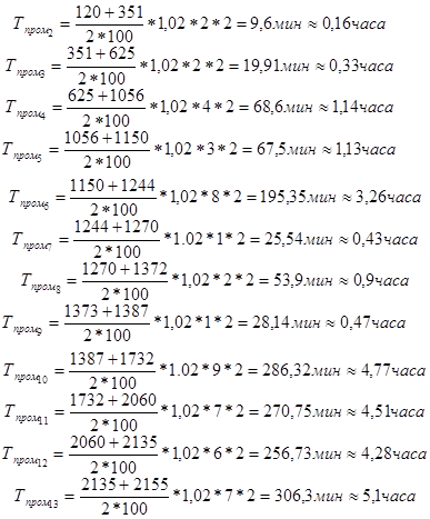 = Тмех.общ. = 13635,71 мин = 227,2 часа Количество наращиваний определяется поинтервально для каждой нормативной пачки по формуле: